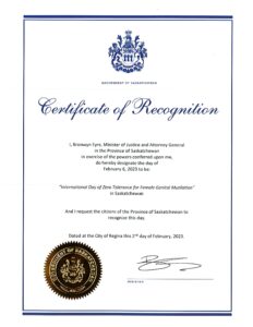 The Government of Saskatchewan has declared February 6, 2023, as “International Day of Zero Tolerance for Female Genital Mutilation” in Saskatchewan.